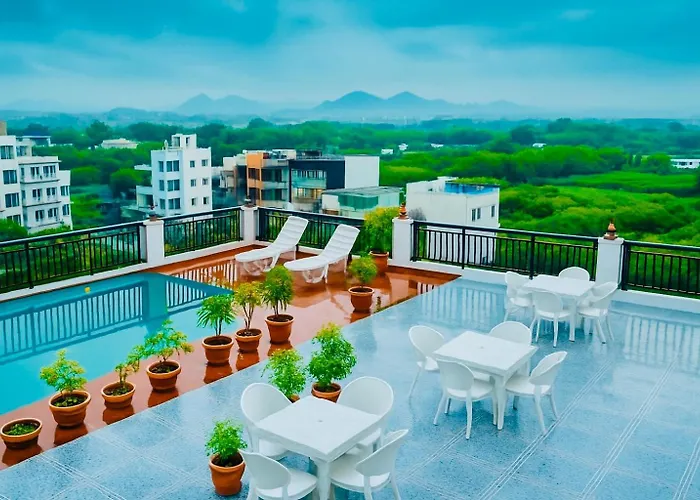 A The De Glance In Udaipur By Naina Staycation - Rooftop Swimming Pool ! Prime Location ! Most Awarded ! Big Parking ! hotel közel van a Bagore-ki-Haveli Múzeum területéhez, amely hozzávetőlegesen 2 km-re található. A hotel az egész ingatlanban Wi-Fi-t kínál, a 36 szobából pedig kilátás nyílik a városra.